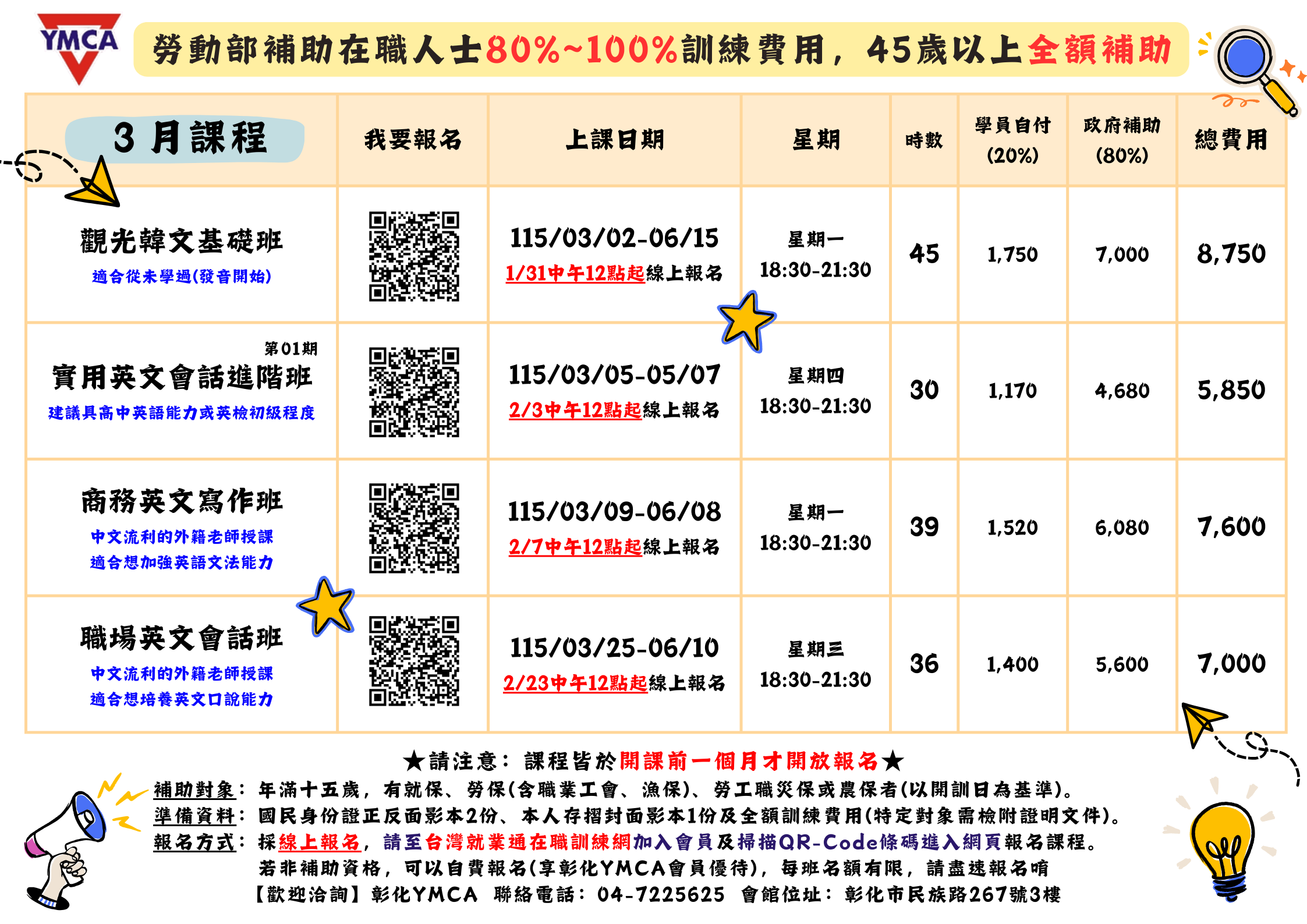 📢彰化YMCA⭐政府補助學費⭐115年3月課程🤩