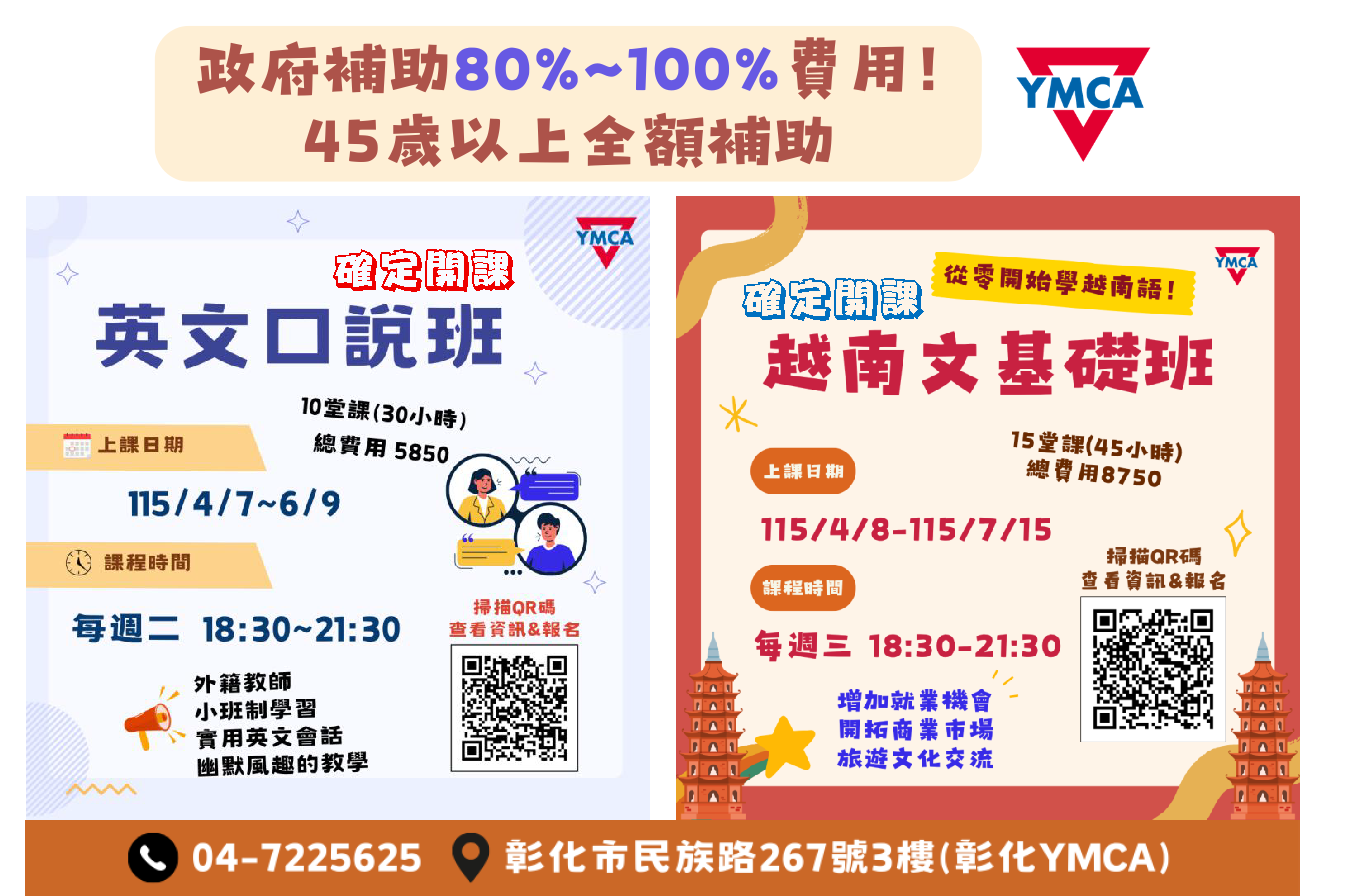 政府補助80~100%費用⭐彰化學英文.彰化學越南文⭐45歲以上全額補助